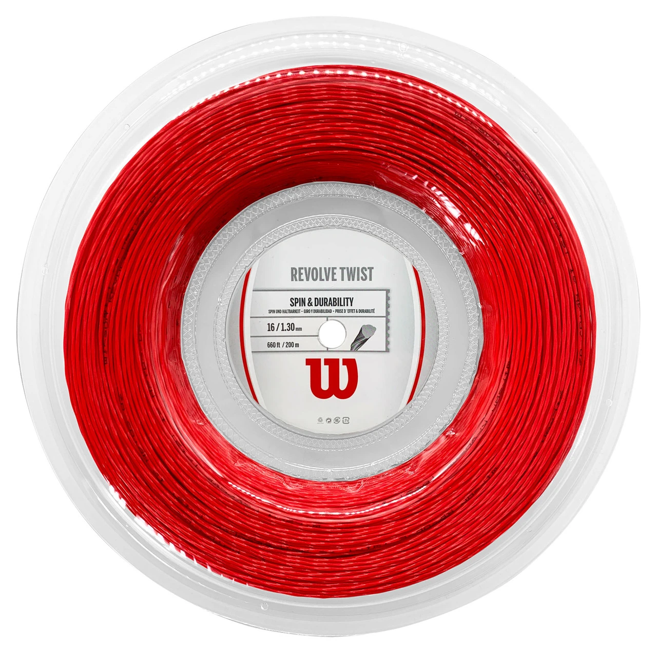 Wilson Revolve Twist 16 1.30mm 200M Reel strings approximately 18 racquets.